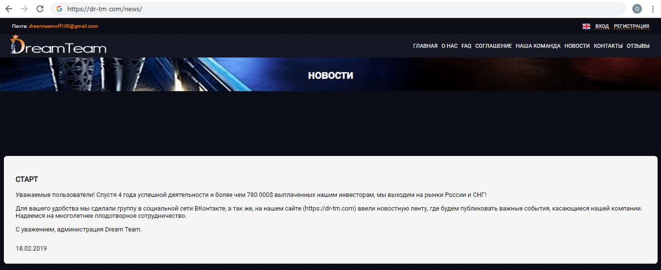 Портал Дрим Тим содержит раздел новостей компании. В его активе находится всего одно сообщение. Оно помещено стазу же после запуска проекта в феврале 2019 года, сообщает об успешной деятельности компании в течение прошедших четырех лет непонятно где и в какой реальности, так как с этого момента компания только выходит на рынок стран СНГ.