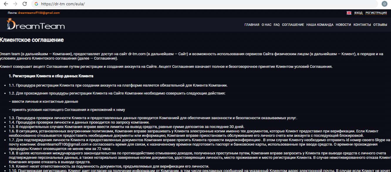- Дрим Тим в своем клиентском соглашении прямо предупреждает своих клиентов о предстоящем скаме
