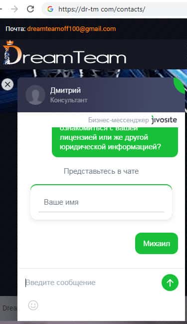 Мы немного лукавили, считая электронную почту единственно возможным видом связи с технической поддержкой Дрим Тим. Портал Дрим Тим предлагает воспользоваться онлайн чатом с постоянным присутствием в нём операторов. После заданного нами вопроса, через две минуты активировался консультант Дмитрий, который,наверное, до сих пор ищет ответ на наш вопрос.