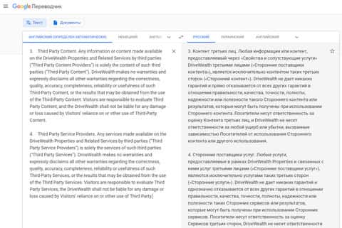 После в условиях у лохотрона Драйв Вэйлт следует информация о том, что шулера Drive Wealth не несут никакой ответственности за информацию третьих лиц, представленную на их подвальном сайте, а так же убытки клиентуры, связанные с этим. На изображении, расположенном ниже, вы можете наглядно увидеть очередной раздел клиентского соглашения мошенников Драйв Вэйлт.