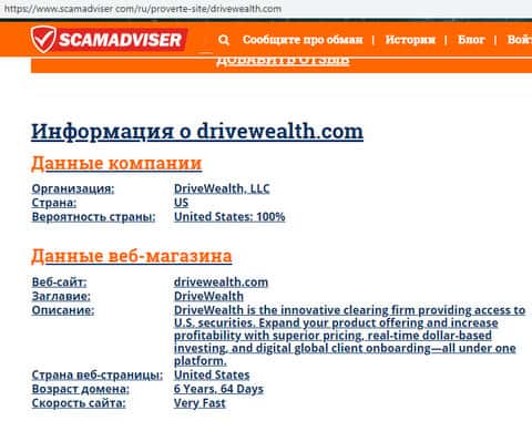 В связи с мошеннической и противозаконной деятельностью лохотрона Драйв Вэйлт его реальные руководители предпочитают анонимность дабы избежать ответственности со стороны правоохранительных органов. Информацию о самом же сайте мошенников Drive Wealth можно узнать с помощью портала scamadviser com, которую вы можете увидеть на изображении, расположенном ниже.
