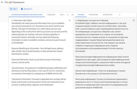 Далее в политике конфиденциальности у шулеров Drive Wealth следует довольно стандартная информация о том, что жулики Драйв Вэйлт собирают личную и персональную информацию своих клиентов, и судя по всему в довольно больших объемах. На изображении, расположенном ниже, вы можете наглядно увидеть очередной раздел политики конфиденциальности жуликов Drive Wealth.