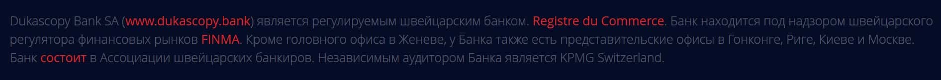 Юридическим лицом финансовой конторы DukasСoin является компания Dukascopy Bank SA , это швейцарский банк, деятельность которого регулируется местной организацией.