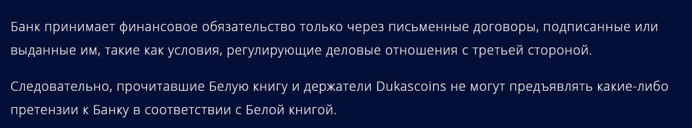 Далее пользователи могут прочитать, что претензии, составленные ими на основании данного документа, не будут приниматься руководством банка Дукас Коин.