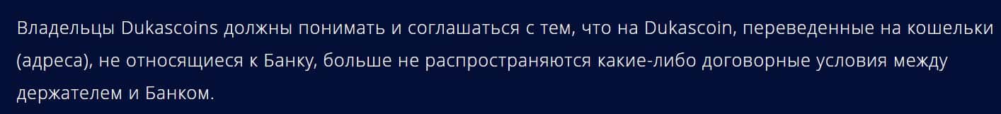 Также в данном документе клиенты могут узнать о том, что на криптовалюту DukasСoin, переведенную на другие кошельки, не распространяются условия данного соглашения.