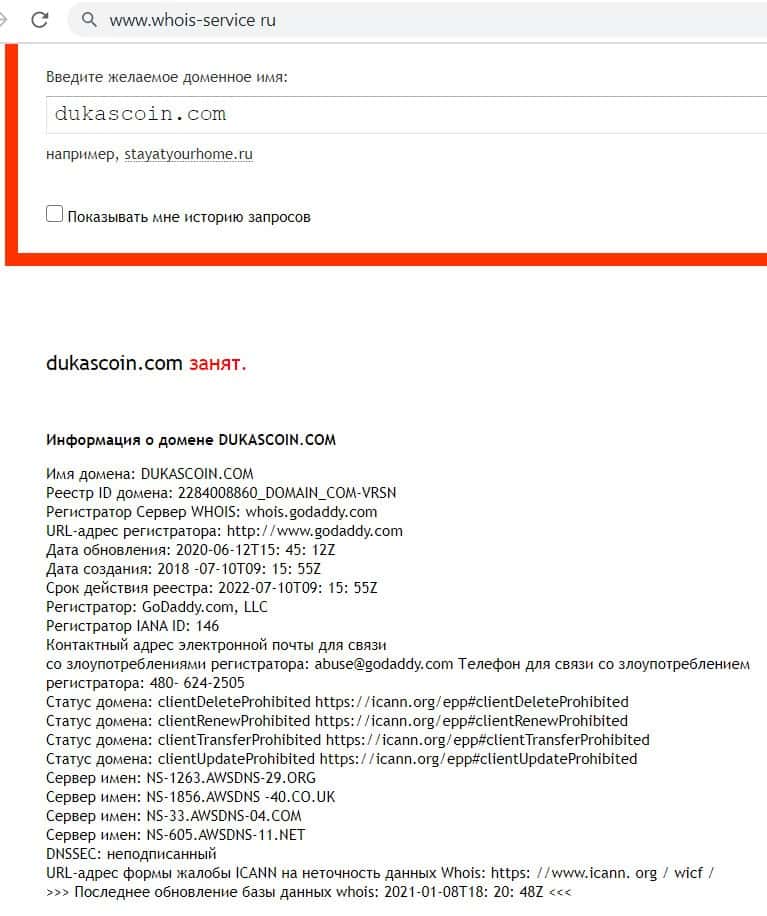 - Кому принадлежит доменное имя сайта dukascoin com?