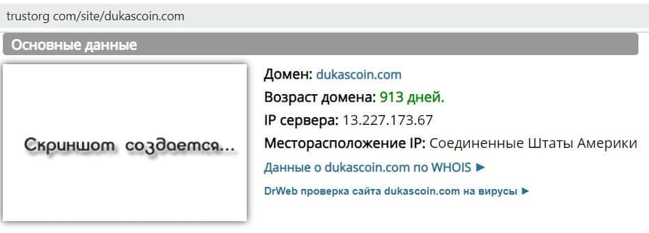 Возраст доменного имени сайта dukascoin com составляет 913 дней. Мошенники разводят людей на деньги с помощью этого ресурса около трех лет.