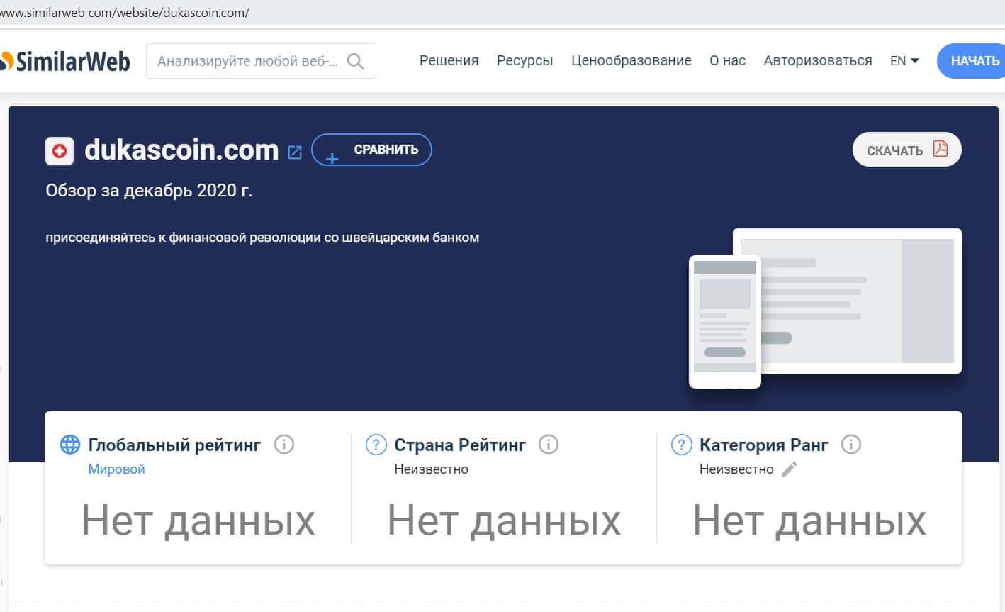 По данным сервиса Симиларвеб, сайт конторы dukascoin com никто не посещает, данная криптовалюта никому не интересна.