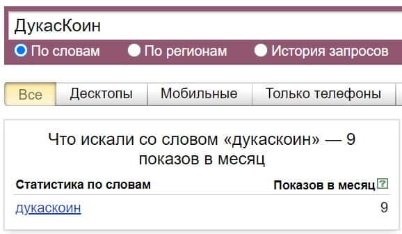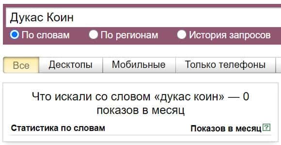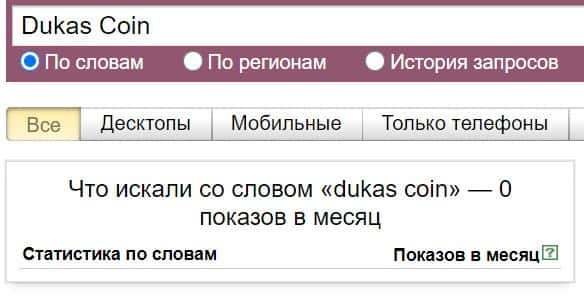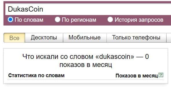 То же название "Dukas Сoin", но написанное с пробелом, люди не пытались найти в системе Яндекс, результат нулевой.