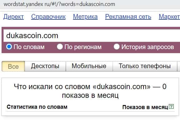 Название мошеннической конторы "DukasСoin", написанное на английском языке, пользователи не искали в системе Яндекс результат - 0 показов.