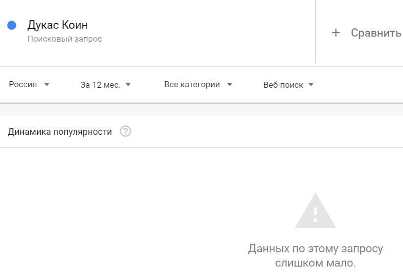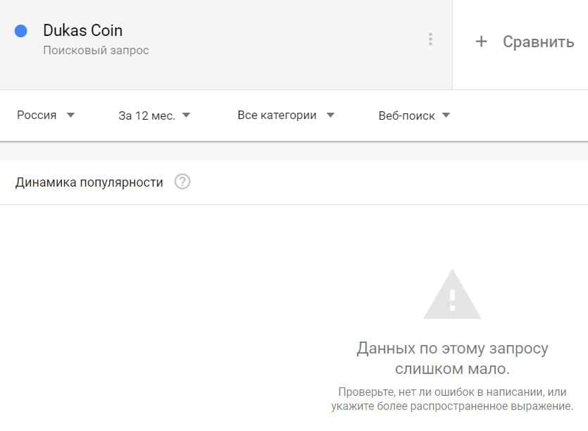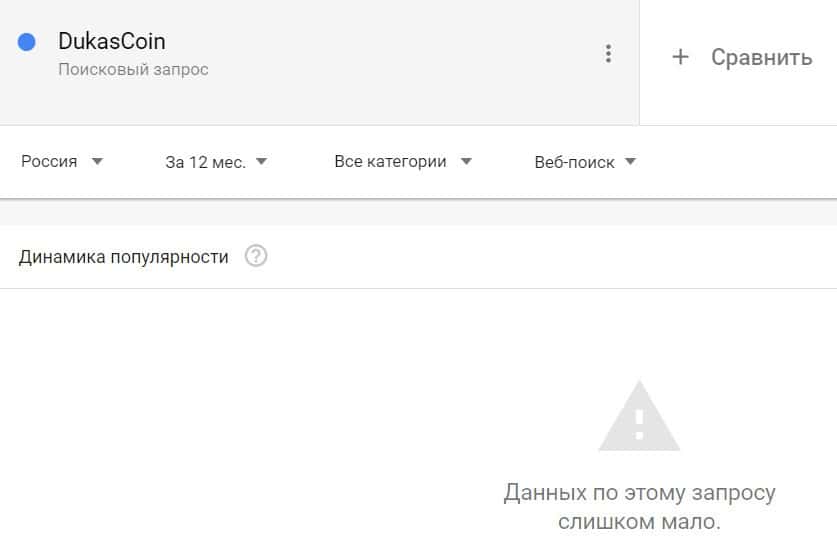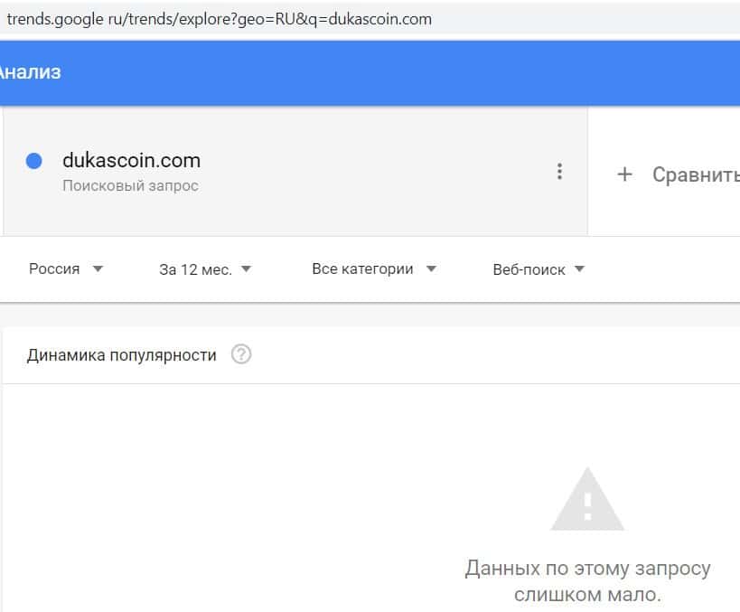Доменное имя мошеннического сайта "dukascoin.com" вбивали в поисковую систему Гугл слишком редко, поэтому данных по этому запросу практически нет.