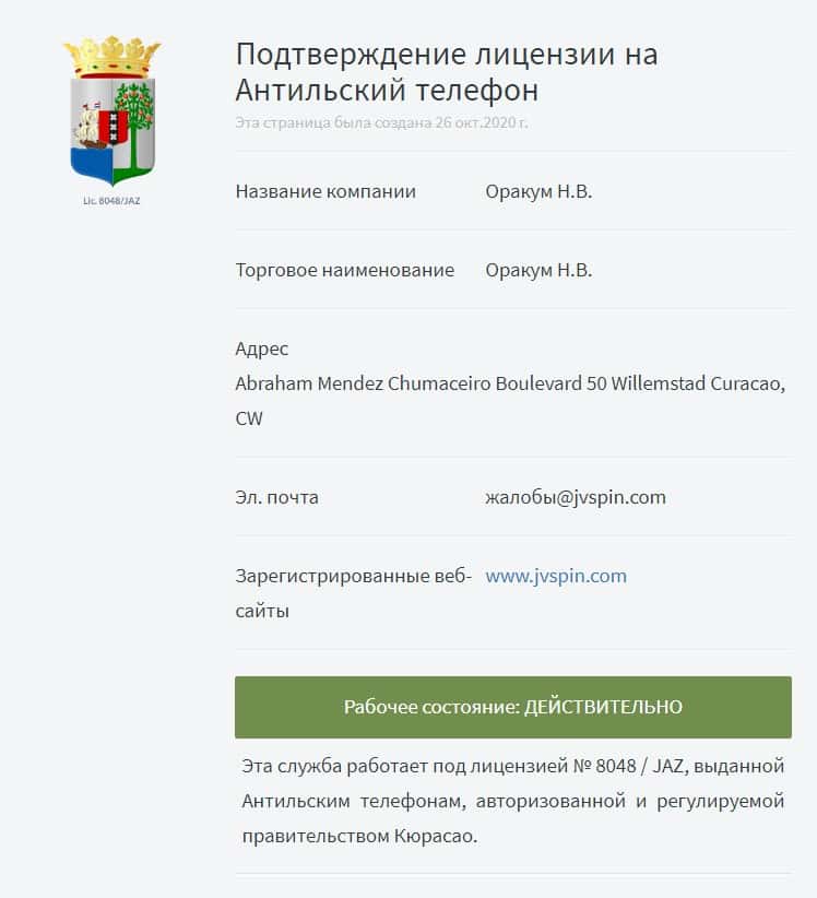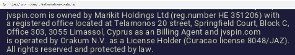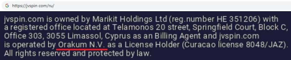 Контора JVSpin на своем официальном сайте указывает информацию о юридических лицах компании, одним из которых является Orakum N.V., который прячется на острове Кюрасао.