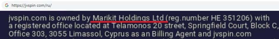 Юридическое лицо Marikit Holdings Ltd владеет мошенническим сервисом jvspin com, компании ДжейВи Спин, у которой Кипрская регуляция.