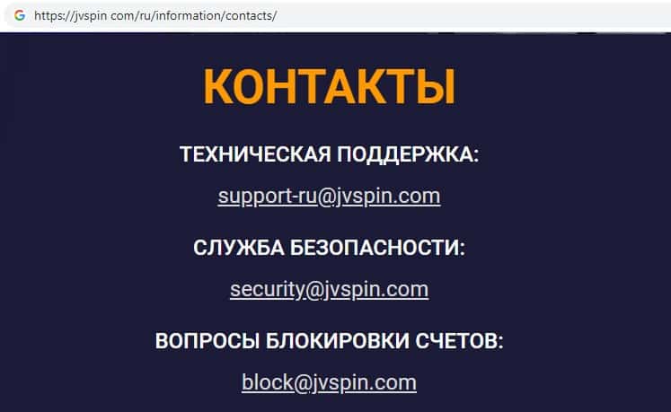 Лохотронщики JVSpin на своем официальном интернет-ресурсе указывают несколько адресов электронной почты, а именно:
