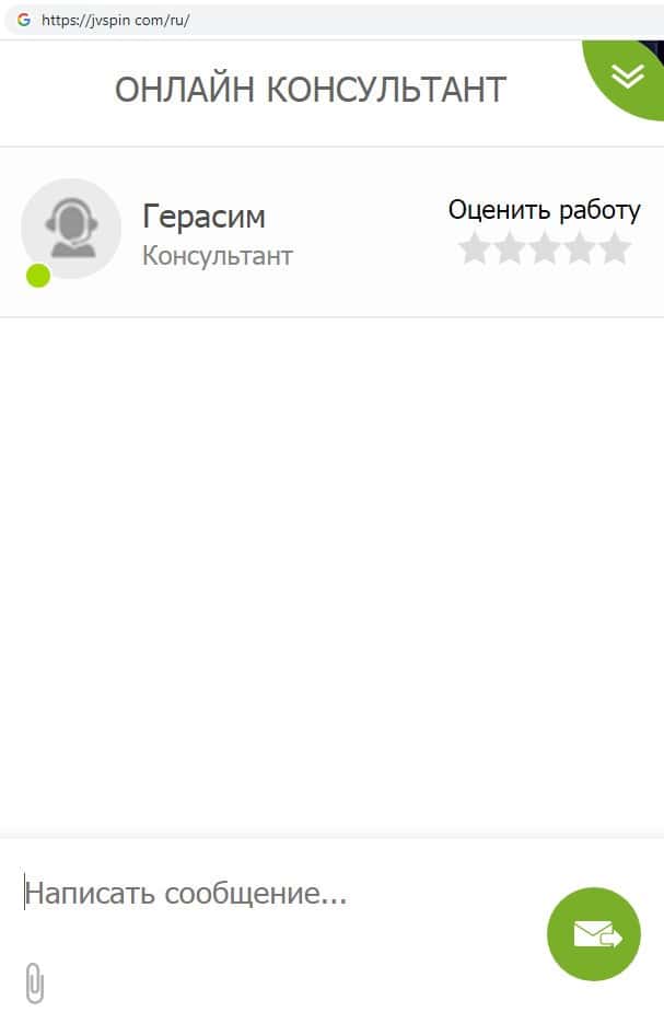 Жулики JVSpin предоставили в качестве обратной связи онлайн-чат, при помощи которого ведут сбор данных о клиенте, фиксируя все данные на сайте.