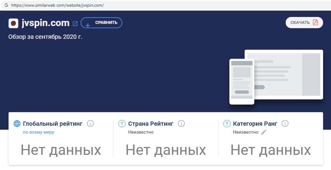 При проверке источников бренда по странам компании ДжейВи Спин на сайте similarweb com, информация отсутствует, что является признаком интернет-лохотрона.