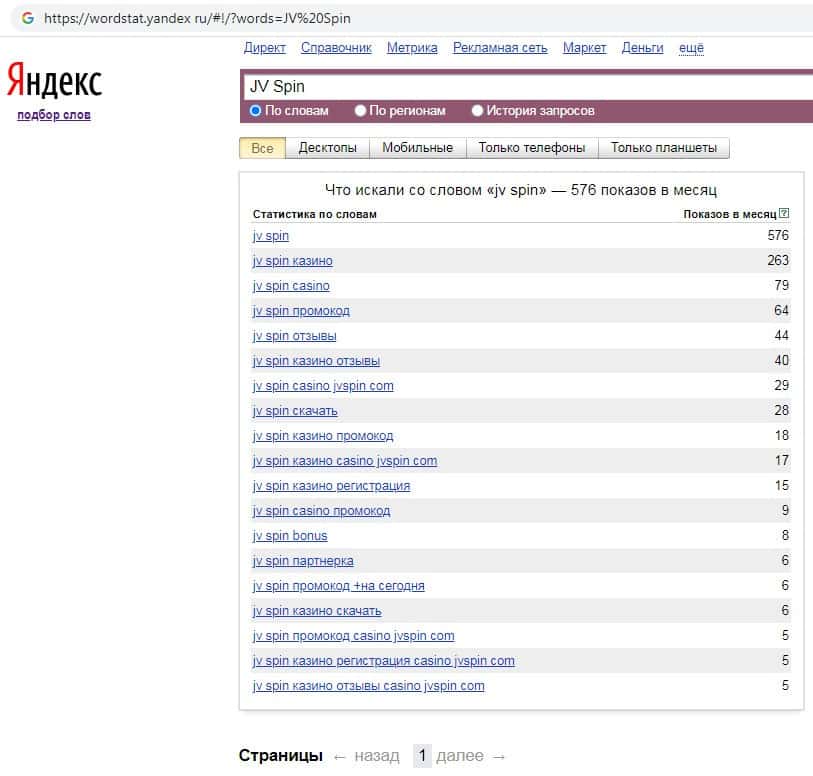 Количество брендовых запросов названия компании на английском языке с пробелом "JV Spin" на wordstat yandex ru составляет 576 показов за месяц.