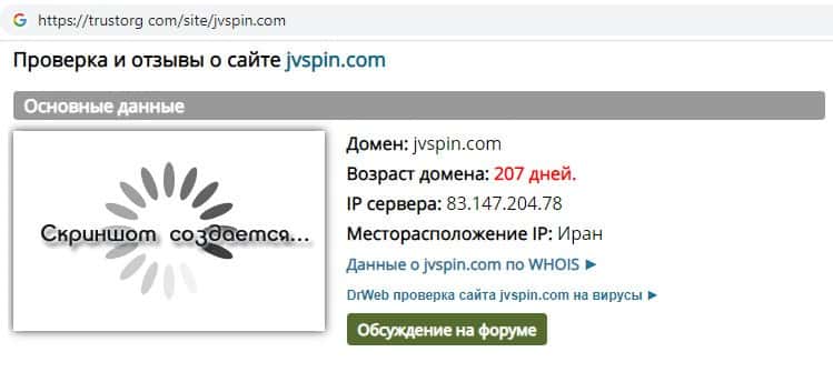 Проверка интернет-сервиса шулеров ДжейВи Спин на trustorg com показала, что возраст домена к моменту написания статьи составляет 207 дней, скорее всего домен купленный.