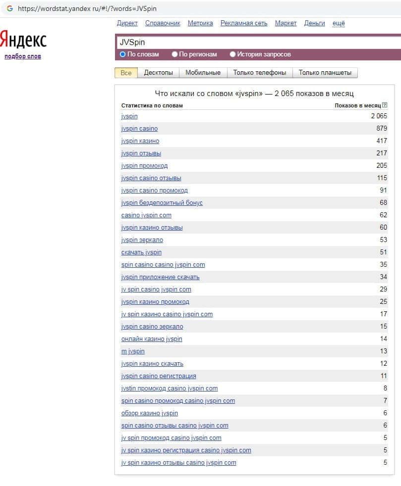 По количеству брендовых запросов названия компании на русском языке с пробелом "ДжейВи Спин" на Яндекс Вордстарт нет никакой информации.