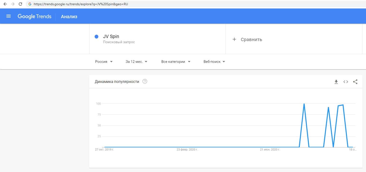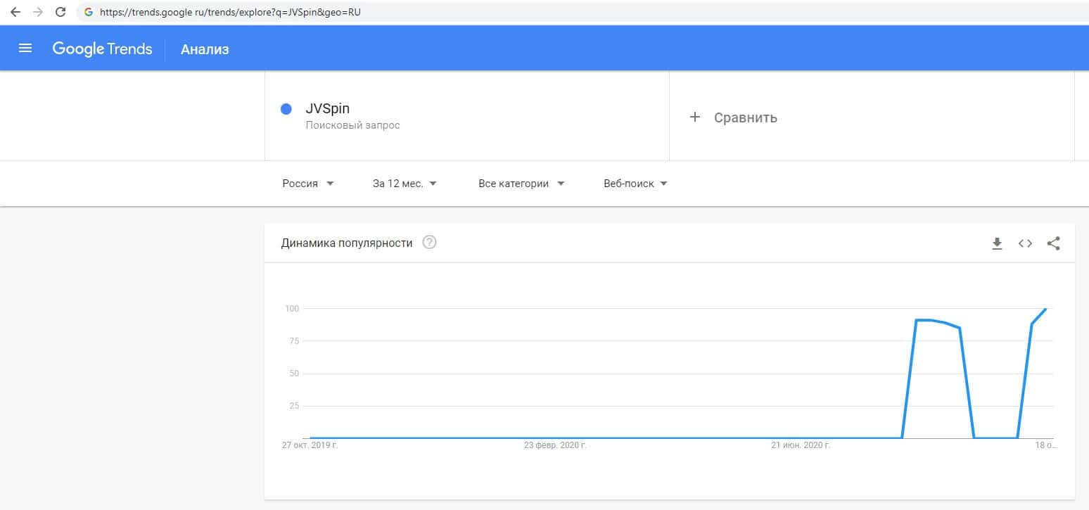 Динамика популярности запросов по бренду названия компании на английском языке без пробела "JVSpin" на Гугл Трендс предоставлена на графике ниже.