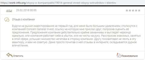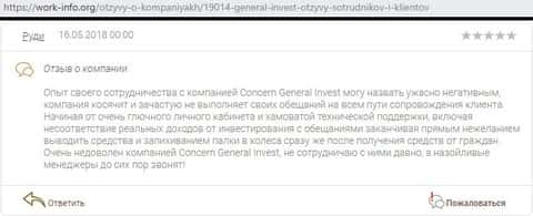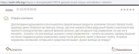 Люди в шоке от того как такая контора до сих пор работает. Негативных сторон настолько много, что не понятно как люди ведутся на это. Кухня General Invest может накосячить в своих действиях и не выполнять обещанного. Брокеры обычно вымогают все больше и больше денег, а в итоге на запрос о выводе прибыли отвечают отказом. Личный кабинет тормозит, а техническая поддержка отвечает резко и грубо. И все это происходит после того как вы положите туда деньги. Так что не советуем работать с данной конторой, наживете себе геморроя и назойливые менеджеры будут доставать вас круглосуточно.