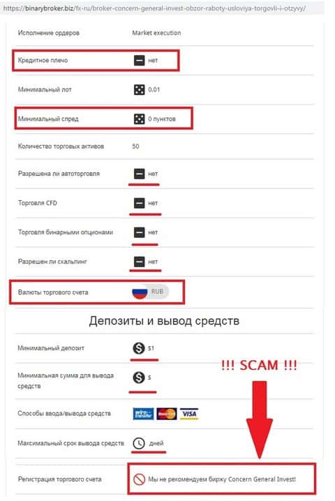 Важнейшие для трейдера показатели, от которых зависит успех торговли на бирже, – величина спреда, лота, кредитное плечо. На сайте binarybroker biz замечаем, что General Invest вообще не дает такой информации. То есть Дженерал Инвест это всего лишь шарашка.