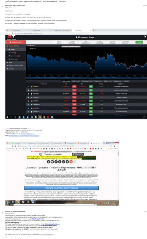 В ход идут любые способы, лишь бы выкачивания бабла продолжалось. Аферисты GeniusTrading будут делать всё чтобы вы вкидывали всё больше и больше. Они даже могут запугивать. Да, вы прочитали правильно. Они не гнушаются никакими способами, лишь бы выманить у запуганных клиентов еще больше, чем они уже потеряли. Естественно, ведь те боятся и хотят вернуть вложенное. К сожалению, в случае с мошенниками GeniusTrading, деньги вернуть почти нереально, и уж точно не через самих аферюг.