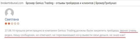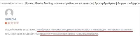 GeniusTrading – очередной мошенник, спекулирующий на теме Интернет-трейдинга. Предлагая как новичкам так и профессионалам в этой сфере возможность научится новому и даже подзаработать, по факту контора Джениус Трейдинг не приносит своим клиентам ничего кроме убытков и испорченных нервов. Причина этому крайне проста: никакого отношения к реальному трейдингу контора GeniusTrading не имеет, вся её платформа – фейк, заскриптованный и прописанный заранее, чтобы создать видимость игры, а вся деятельность мошенников заключается только в разводе клиентов на бабло. Ни в коем случае не доверяйте свои средства мошенникам Джениус Трейдинг и им подобным!
