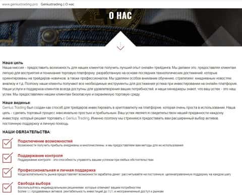 Интернет-ресурс жуликов GeniusTrading оформлен типично для всех лохотронов. Предлагаем сыграть в одну игру. При чём она работает не только с Джениус Трейдинг, а с любым другим брокером. Просто прочитайте хотя бы абзац информации на сайте, и пытайтесь осознать что конкретно вы поняли о компании. То-то же, кроме воды и расплывчатых обещаний жулики GeniusTrading не предлагают ничего. Конечно, кроме потери всех вложенных средств.