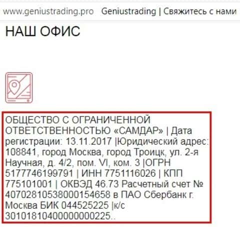 Это уже упоминалось в предыдущих разделах. Просто как двери: жулики Джениус Трейдинг не имеют права на законную деятельность. Более того, никакой реальной инфы о этой конторе нету в принципе. В разделе контактов есть что-то напоминающее данные о предприятии. Вроде и написано грамотно. Даже идентификационный номер налогоплательщика (ИНН) есть. Тут всё очень просто и не менее прозаично.