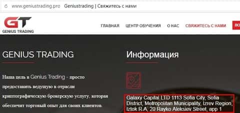 Что же по поводу данных о контактах и руководстве шарашкиной конторы Джениус Трейдинг. Ожидаемо, глухо. Кроме русского адреса (фейкового), предоставлен также какой-то адрес в Болгарии на имя компании Galaxy Capital LTD по адресу 1113 Sofia City, Sofia District, Metropolitan Municipality, Izrev Region, Iztok R.A, 20 Rayko Aleksiev Street, app 1. Естественно, это липа. Ничего ни с названием Genius Trading, ни Galaxy Capital там попросту нет.