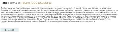 В сети множество отзывов негативно характеризующих инвестиционную площадку Джет Ленд, называющих её финансовой пирамидой и тому подобных. Вот пример.