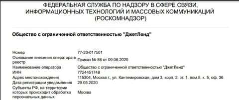 - Регистрационные данные портала аферистов Джет Ленд