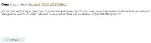 Очередной обманутый инвестор описывает в своем отзыве сотрудничество с инвестиционной площадкой Джет Ленд, которое обошлось ему в 300 тысяч рублей. Полиция бессильна.