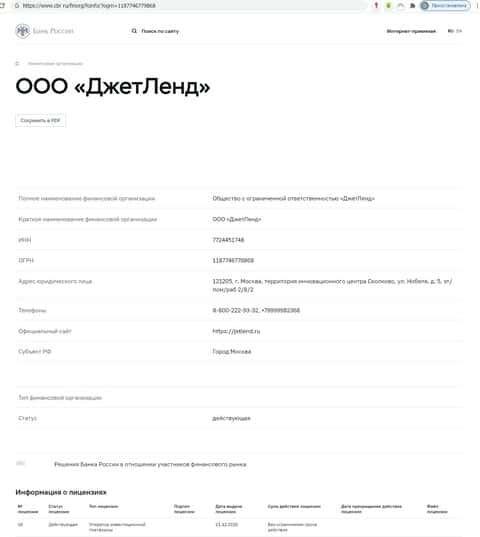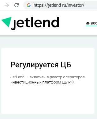 Сайт мошенников Джет Ленд пестрит заявлениями о своём регулировании Центральным Банком Российской Федерации, о включении жуликов в реестр инвестиционных платформ.