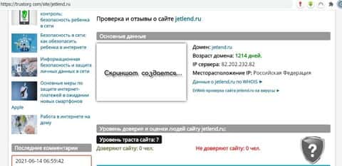 На фоне того, что сайт инвестиционной площадки Джет Ленд работает в сети уже 1214 дней, сайту "Доверие в сети" так же не удалось провести какой-либо серьезный анализ портала jetlend ru.