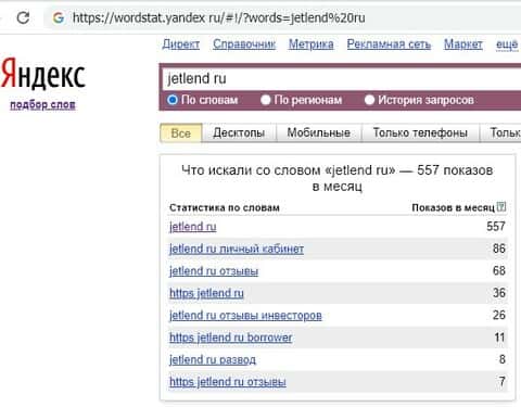 Обзор поисковых запросов информации о инвестиционной афере Джет Ленд в поисковой системе Яндекса