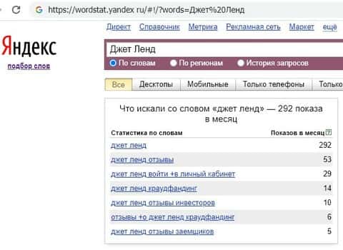 - Обзор поисковых запросов информации о инвестиционной афере Джет Ленд в поисковой системе Яндекса