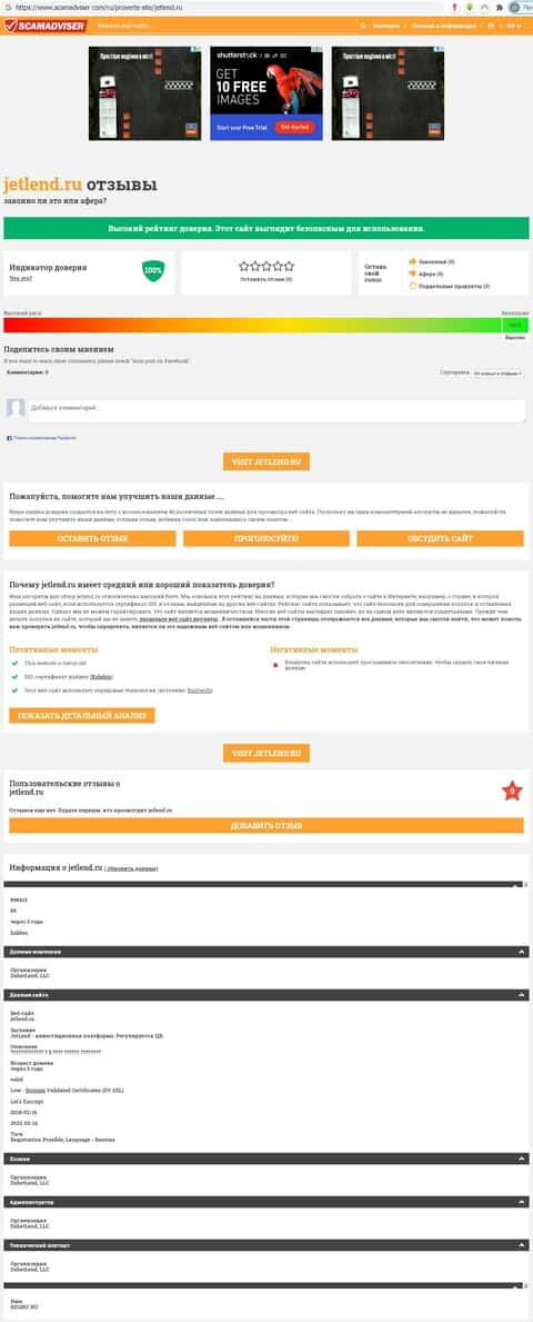 Портал scamadviser выставляет стопроцентный уровень доверия к инвестиционной площадке Джет Ленд, и это несмотря на тот факт, что владелец ресурса скрывает свои личные данные.