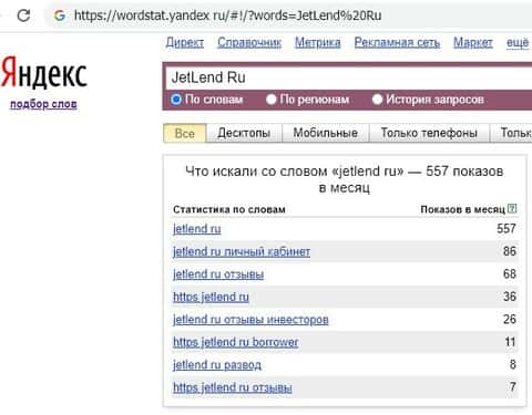 Сайт инвестиционной конторы "jetlend ru" искали те же пятьсот пятьдесят семь раз за месяц в поисковой системе Яндекса. Общий интерес пользователей невысок к данному бренду.