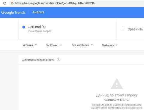 Аналогичная ситуация и с поиском самого портала мошенников "jetlend ru" в поисковой системе Гугл. Популярностью поиска данного лохотрона и "не пахнет".