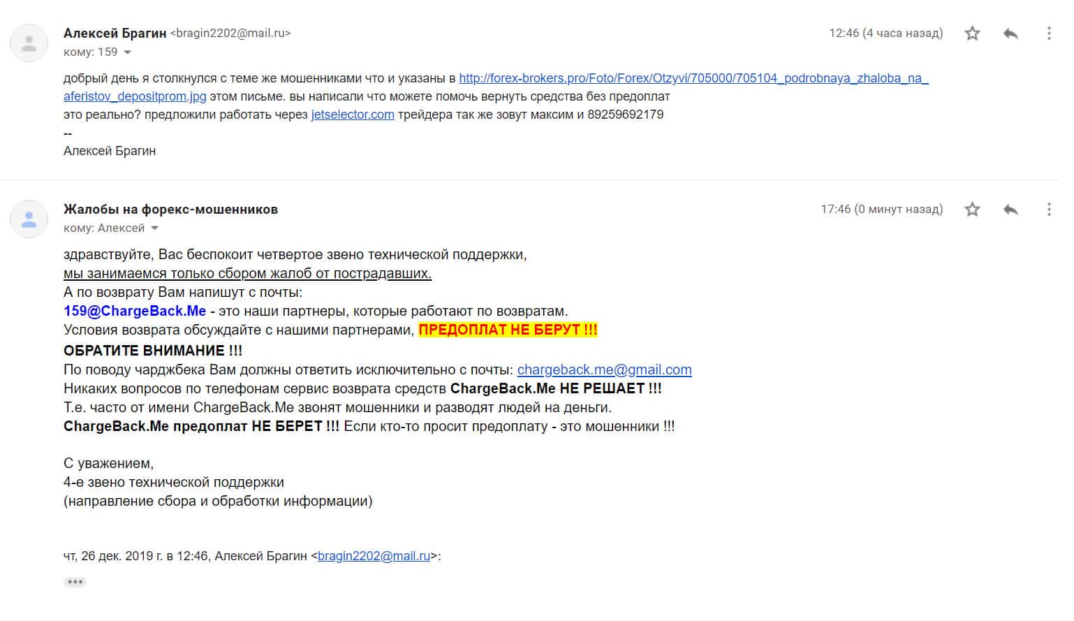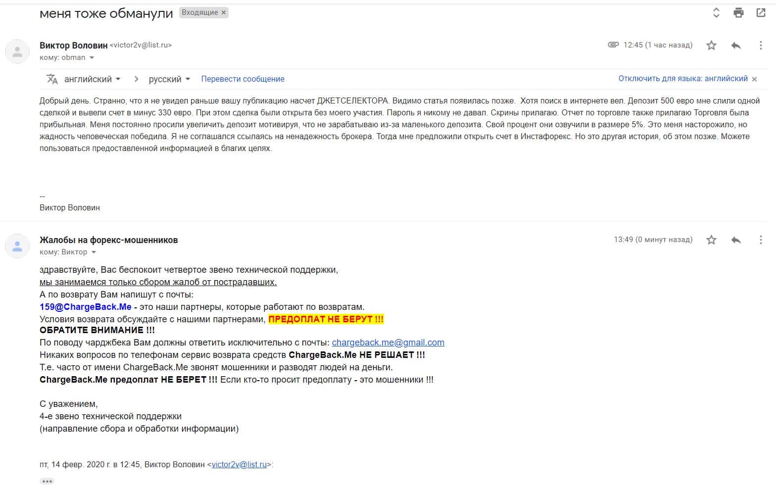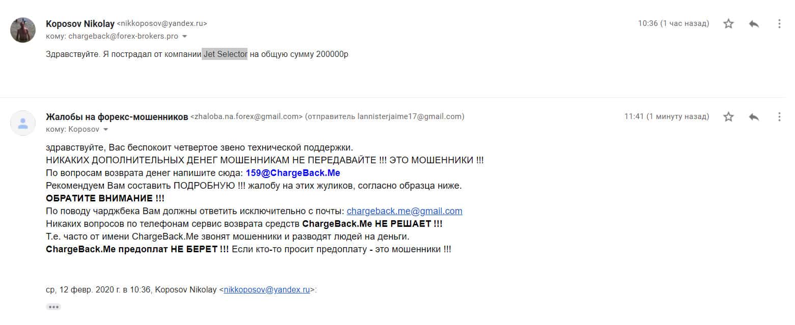 На публикации ниже представлена жалоба на аферистов Джет Селектор от одного из пострадавших клиентов данного форекс-лохотрона, которого опрокинули в общей сложности на сумму в размере 200 тысяч рублей и теперь обманутый человек написал письмо на емайл сервиса, оказывающего услуги помощи в возврате утраченных денег.