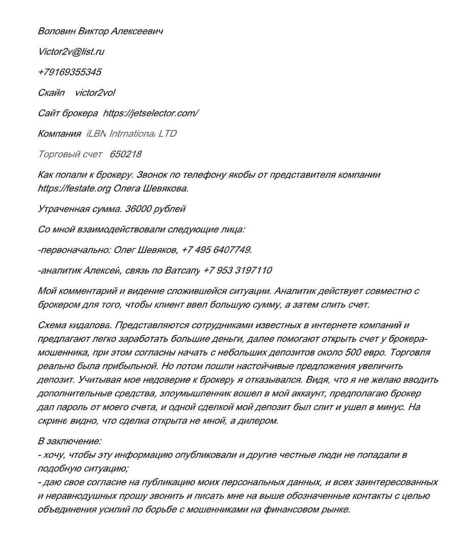 Подробная жалоба на Jet Selector от клиента, потерявшего 36 000 рублей
