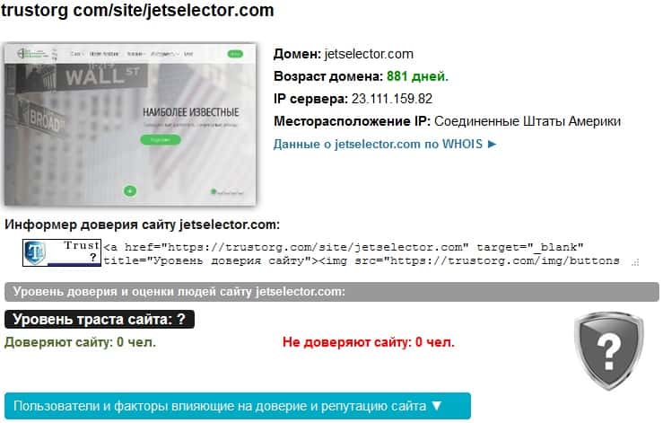Есть такой известный авторитетный ресурс в интернете, как Доверие в Сети. На нем пользователи могут ставить свои оценки той или иной компании. Так вот там вы не найдете ни единой оценки деятельности компании JetSelector, потому что они также удалены по жалобам. Эта ситуация говорит сама за себя, что они специально подчистили все.