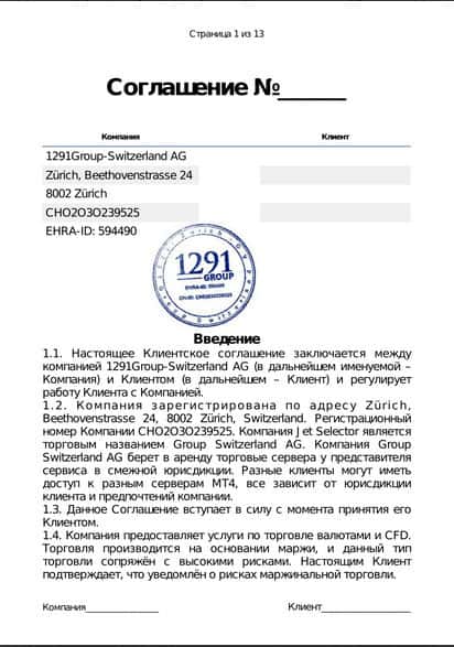 Клиентское соглашение жулики JetSelector на своем сайте показывают. Даже каждый лит представлен отдельным сканом, чтобы удобнее было читать. Но это ничего не меняет и не дает никаких гарантий, потому что нет даже нормальной регистрации у жуликов. Вы потом этот договор просто нигде не сможете предъявить и все.