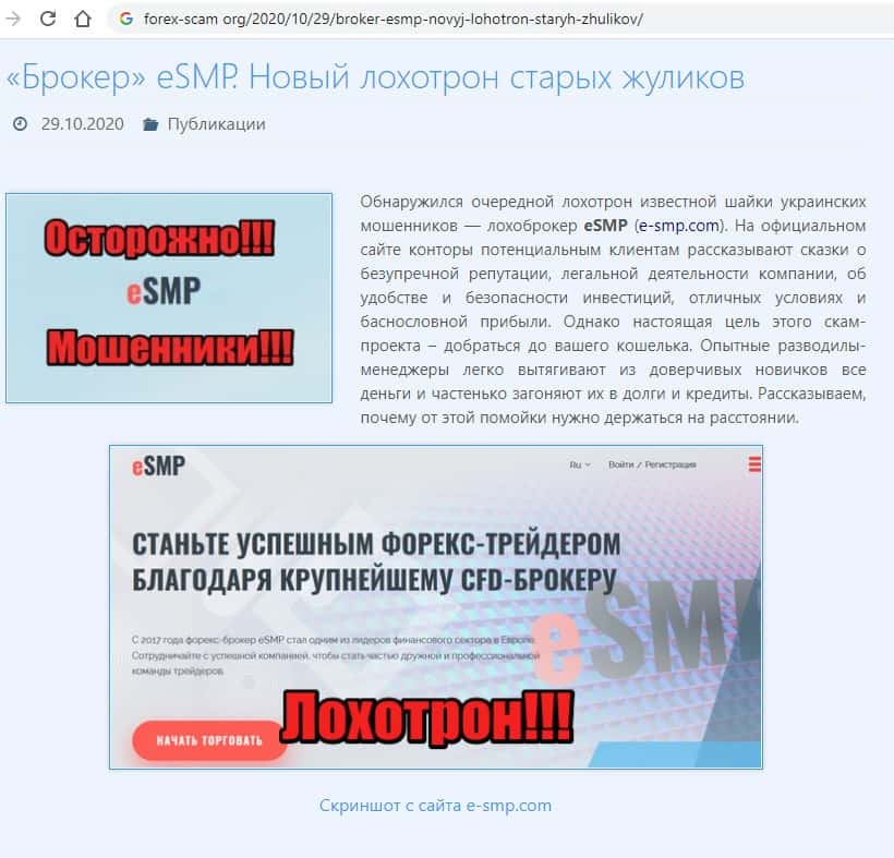 Далее представлена статья о мошеннических форекс-конторах, которые орудуют в Украине. Также там фигурирует кухня Е СМП, так как обворовала уже не одну сотню наивных людей.
