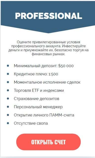Третий и последний тип счета, который предлагают жулики своим клиентам - PROFESSIONAL с минимальным депозитом в 50 000$ и кредитным плечом 1:500.