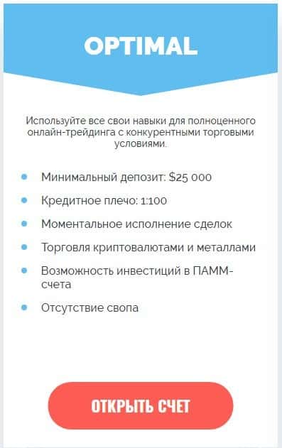 Второй тип счета, который предлагают открыть клиентам жулики Е СМП - OPTIMAL с начальным капиталом в 25000$ и кредитным плечом 1:100.
