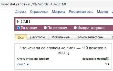 Начинаем с запроса на русском языке. Первый запрос на русском языке в яндексе Е СМП выдает результат в 13 показов в месяц.