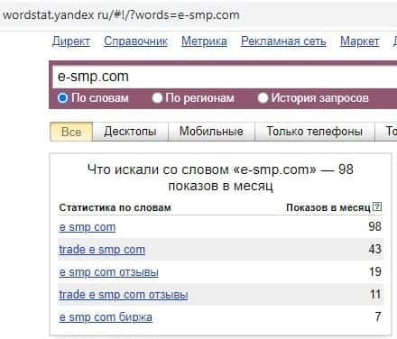 Третий и последний запрос в яндексе на русском языке с точкой " e-smp.com" выдает уже результат в 98 показов в месяц.